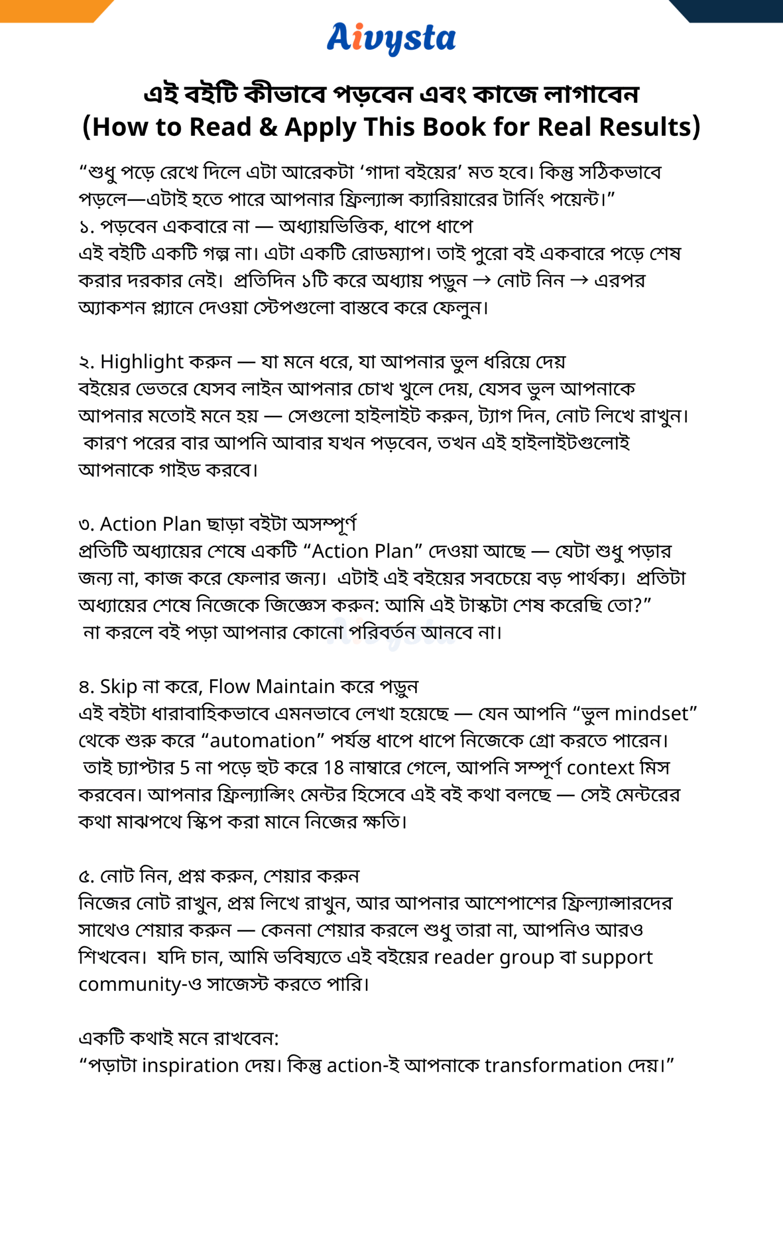 📌 প্রতিটি চ্যাপ্টারের শেষে যে Action Plan দেওয়া আছে, সেটা শুধু পড়বেন না — Apply করবেন