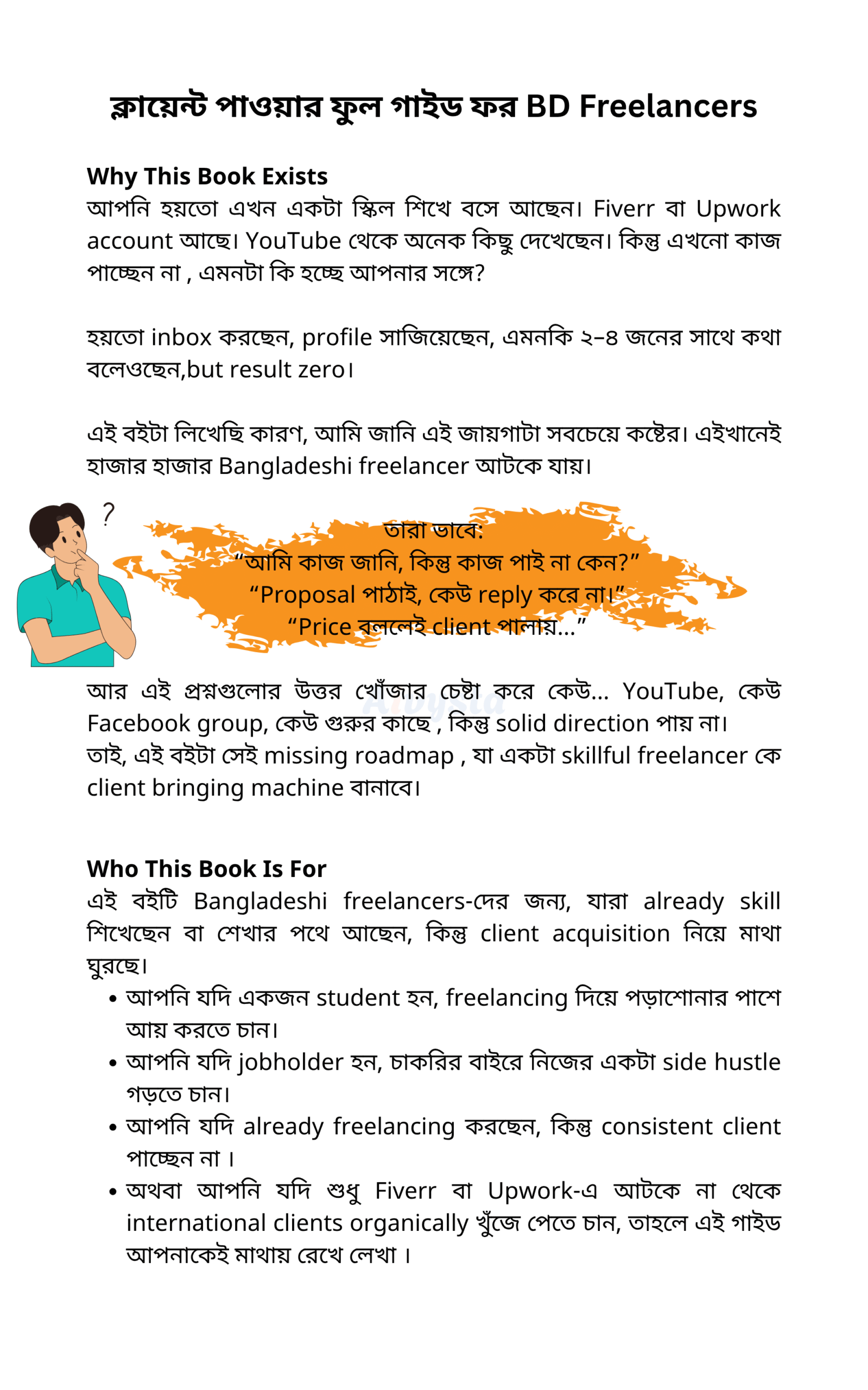 এই বই শেখাবে এমন একটি ক্লায়েন্ট পাওয়ার সিস্টেম, যা শুধু Fiverr/Upwork-এ প্রোফাইল বসানো নয় — বরং নিজেকে সঠিকভাবে প্রস্তুত করে, ক্লায়েন্টের মন জয় করার জন্য আপনাকে তৈরি করে।